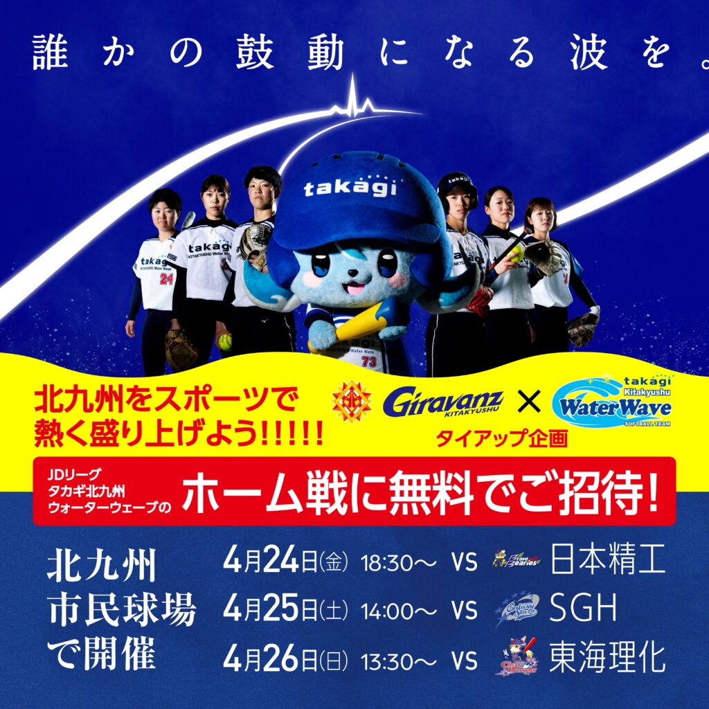 4月24~26日の北九州ホーム戦でギラヴァンツ北九州ファンクラブカードをご提示いただくと、ウォーターウェーブの試合を無料でご観戦いただけます。この機会にぜひ球場で、熱いプレーを体感してください🔥